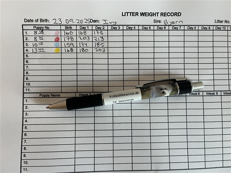 Med vores hvalpe følger DKK stambog, Sundhedsbog, vejledning i pelspleje, foder, et tæppe der dufter af mor og en hvalpepakke med karte, kamme, bamse og lidt legetøj.