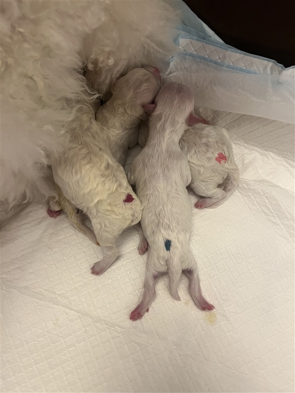 Mor og hvalpe har det godt og de små var meget hurtige at finde mors patter og tager rigtig fint på.